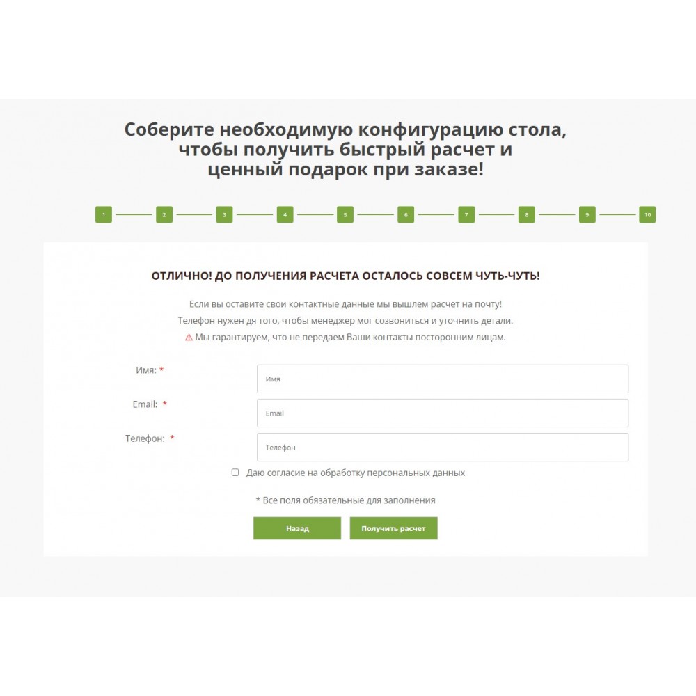Квиз может быть оснащен любым количеством параметров - от возможности выбора размера, цвета и материала, до возможности сборки индивидуальной конфигурации с подбором дополнительных комплектующих.